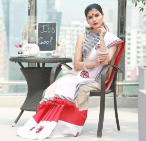 স্ট্রাইপ এখন বেশ জনপ্রিয়। এই গরমেও চলবে। হল্টারনেক ব্লাউজটি সেই নকশারই একঝলক। সুতির শাড়িতে ব্লকের নকশা সাজানো হয়েছে আধুনিক আর ঐতিহ্যের ছোঁয়ায়। শুধু হলুদের অনুষ্ঠানেই যে উল্টো আঁচল দিয়ে শাড়ি পরা মানায়, তা নয়। যেকোনো দাওয়াতে আপনিও এই স্টাইলে শাড়ি পরতে পারেন।