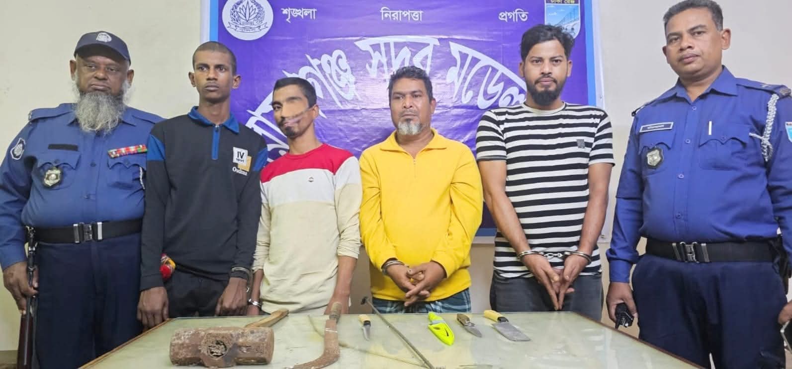 বর্তমান : (০২ নং বাবুরাইল কুতুব মিয়ার বাড়ীর ভাড়াটিয়া) , উপজেলা/থানা- নারায়নগঞ্জ সদর, জেলা -নারায়ণগঞ্জ, বাংলাদেশ আসামী ০২। হৃদয় সিকদার @ সুমন আহমেদ (২৮), পিতা- খোকন সিকদার @ শরাফত @ কামাল, মাতা- মায়া বেগম, স্থায়ী : বর্তমান : গ্রাম- ভূইয়া পাড়া (৪৮৪/৪ শাহ সুজা রোড) , উপজেলা/থানা- নারায়নগঞ্জ সদর, জেলা -নারায়ণগঞ্জ, বাংলাদেশ। আসামী ০৩। মো: সজল (২১), পিতা- মো: শুক্কুর আলী, মাতা- মোছা: নাজমা, স্থায়ী : গ্রাম- গঙ্গীপাড়া, উপজেলা/থানা- রাঙ্গাবালী, জেলা -পটুয়াখালী, বাংলাদেশ বর্তমান : গ্রাম- নারায়নগঞ্জ (জল্লাপাড়া মসজিদ গলি সুমনের বাড়ীর ভাড়াটিয়া) , উপজেলা/থানা- নারায়নগঞ্জ সদর, জেলা -নারায়ণগঞ্জ, বাংলাদেশ আসামী ০৪। মো: মকবুল সরদার (৪০), পিতা- মৃত সুলতান সরদার, মাতা- আনোয়ারা বেগম, স্থায়ী : গ্রাম- সৈয়দপুর (সৈয়দপুর বড় বাড়ী) , উপজেলা/থানা- নারায়নগঞ্জ সদর, জেলা -নারায়ণগঞ্জ, বাংলাদেশ গ্রেফতার পূর্বক তাদের হেফাজত হতে মোট সুইচ গিয়ার ২টি, চাপাতি ১টি, ছোড়া-২টি, রড-৫টি, হাম্বল-১টি, উদ্ধার’সহ পলাতক ০৩ জন অজ্ঞাতনামা ৫/৭ জনের বিরুদ্ধে মামলা দায়ের করা হয়।